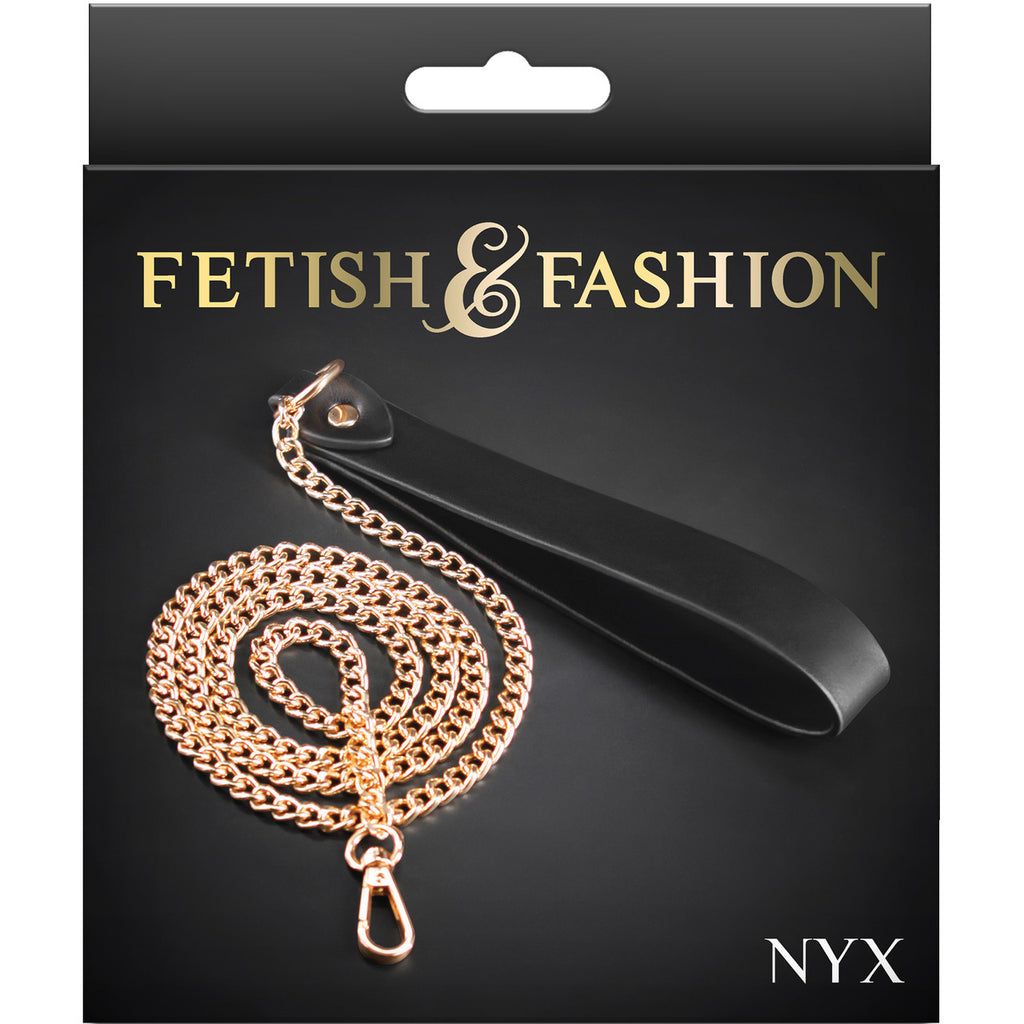 Fetish & Fashion's Nyx Leash is the perfect accessory for any Fetish & Fashion collar. Featuring a super-soft handle and nickel-free golden chain, Nyx is the ideal addition for sexy restraint and other bondage play. Assorted Fetish & Fashion collars sold separately.