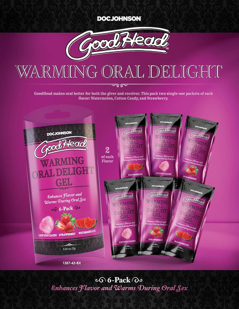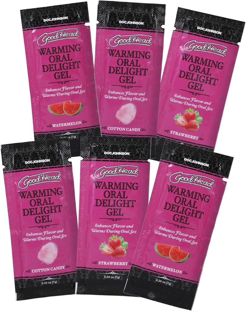 GoodHead From Doc Johnson makes oral better for both the giver and receiver. This pack two single-use packets of each flavor: Strawberry, Cotton Candy, and Watermelon.