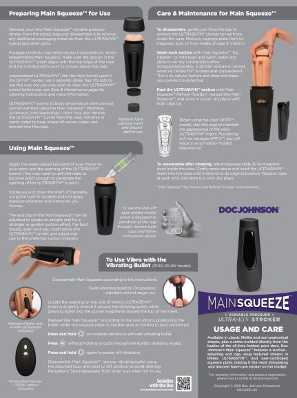 Specifications: 7.5 inches in total length, 7.5 inches insertion length by 3 inches in width. Circumference 9.5 inches. Added new instructions page of how to use. Plus one page with all the other Main Squeeze Strokers and Main Squeeze products. 2020.