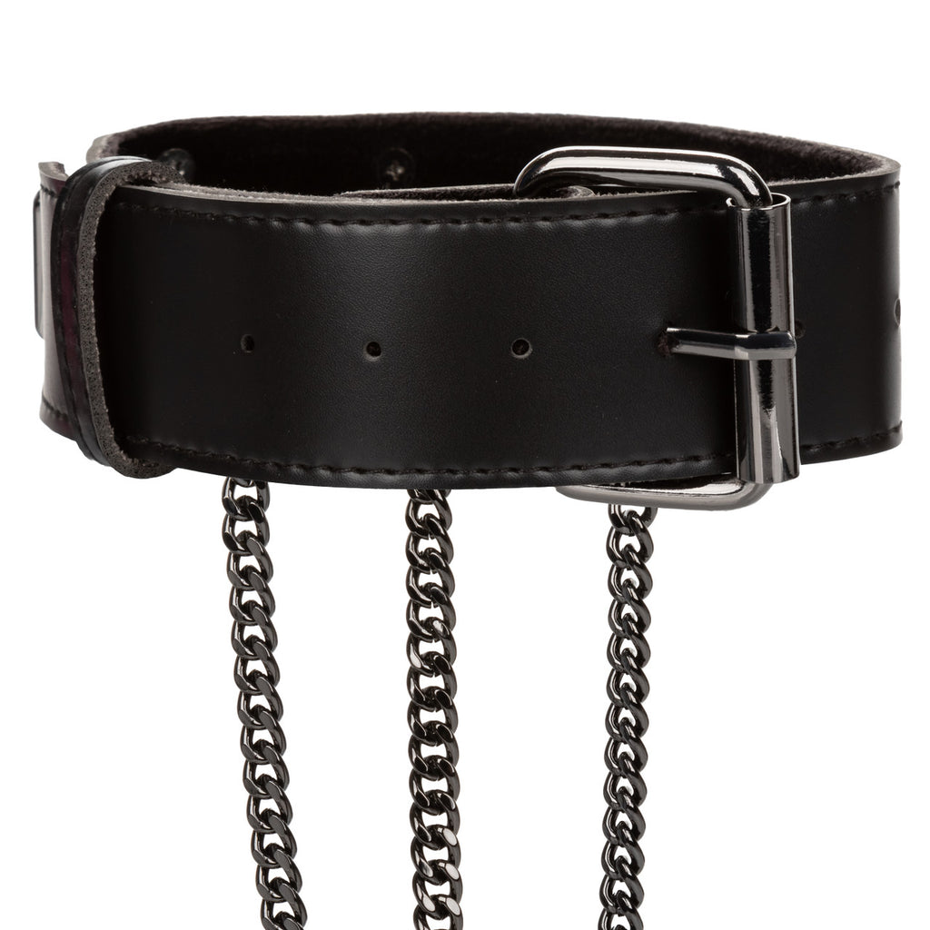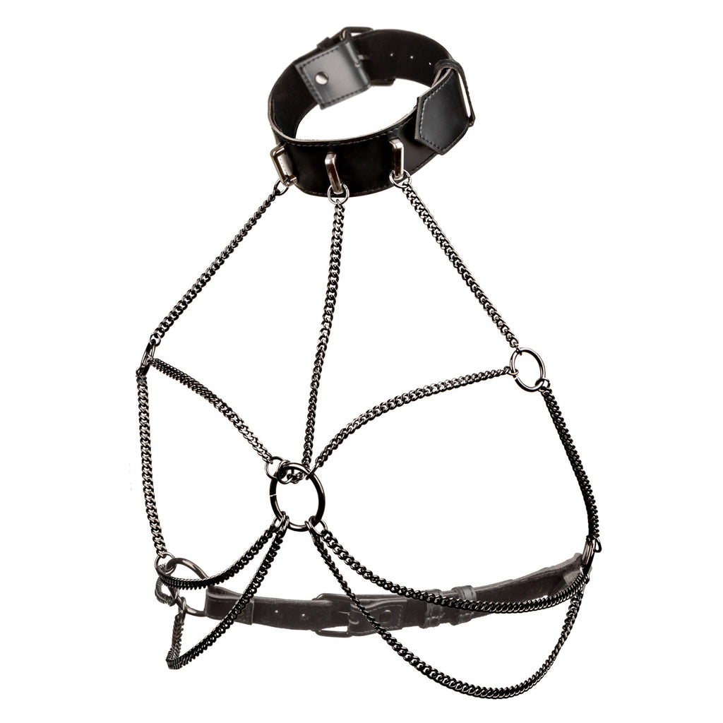 Euphoria Multi Chain Collar Harness from California Exotic Novelties. Unleash your desires with the Euphoria Collection Multi Chain Collar Harness. This premium accessory combines style and comfort for an enchanting experience. The captivating multi-chain design and sturdy collar ensure a secure and comfortable fit. Whether you are looking to spice up your intimate moments or add a unique touch to your festival look, this multi chain harness is the perfect choice to make a bold statement. The harness features a convenient buckle closure for easy adjustment, allowing you to personalize the fit to your liking. Its functional and contemporary design ensures durability, making it suitable for passionate encounters, adventurous play, or a night out. Indulge in the luxurious feel of the soft velvet interior, while the vegan leather exterior adds a touch of sophistication. With double padding and stitching, the harness offers both comfort and reliability during intense moments. The non-tarnishing metal accents add an elegant touch, elevating the overall aesthetic. Designed to accommodate most standard sizes, this harness embraces your body and allows you to express your sensuality confidently. Experience the fusion of fetish and fashion with the Euphoria Collection Multi Chain Collar Harness. Let it ignite your passion and unleash your imagination as you indulge in unforgettable moments.