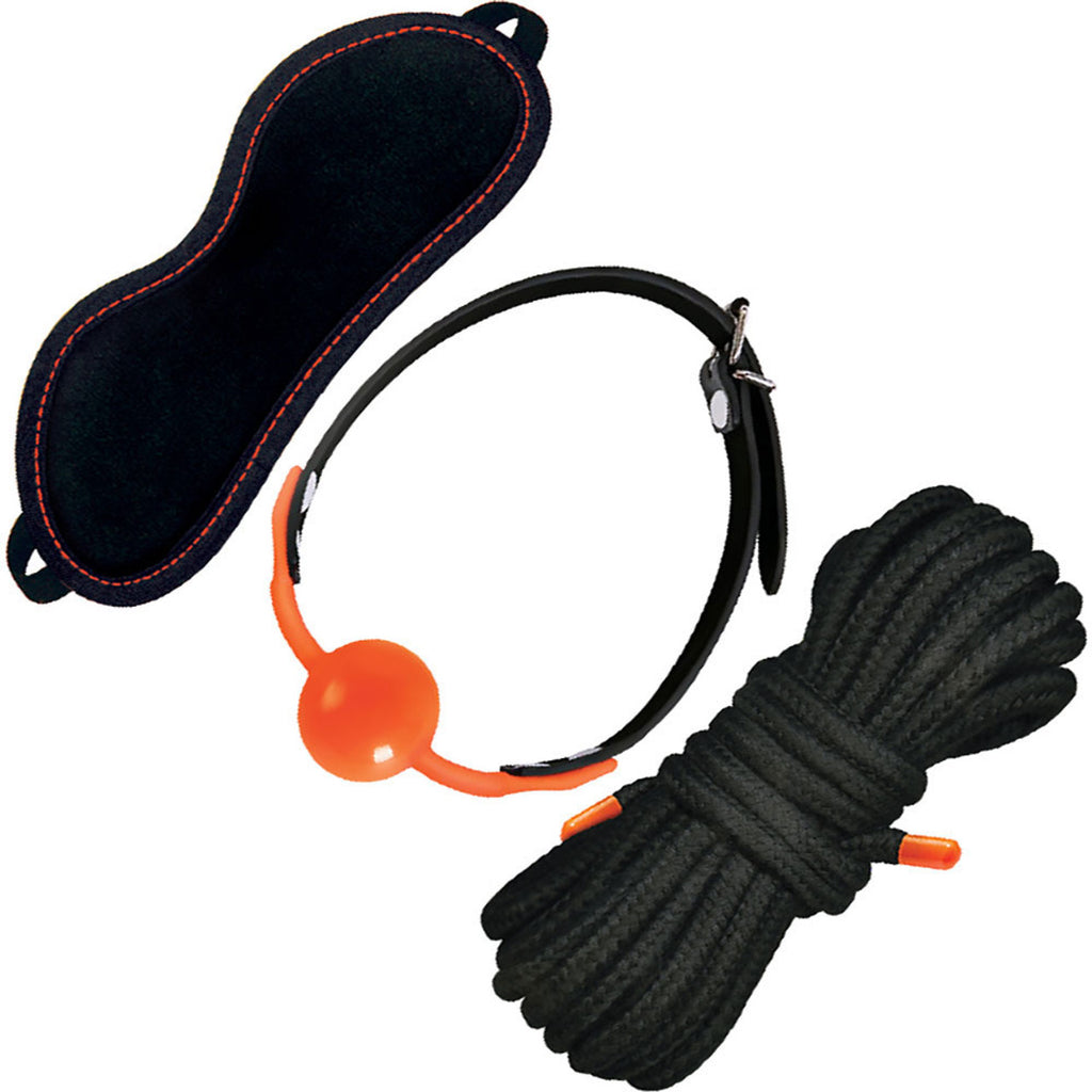 Features: Velvet Blindfold, Silicone Ball Gag, 16 feet Cotton Rope. Beautifully Hand Crafted. Sexy Orange Detail and Stitching. Perfectly Kinky Beginner Fun.