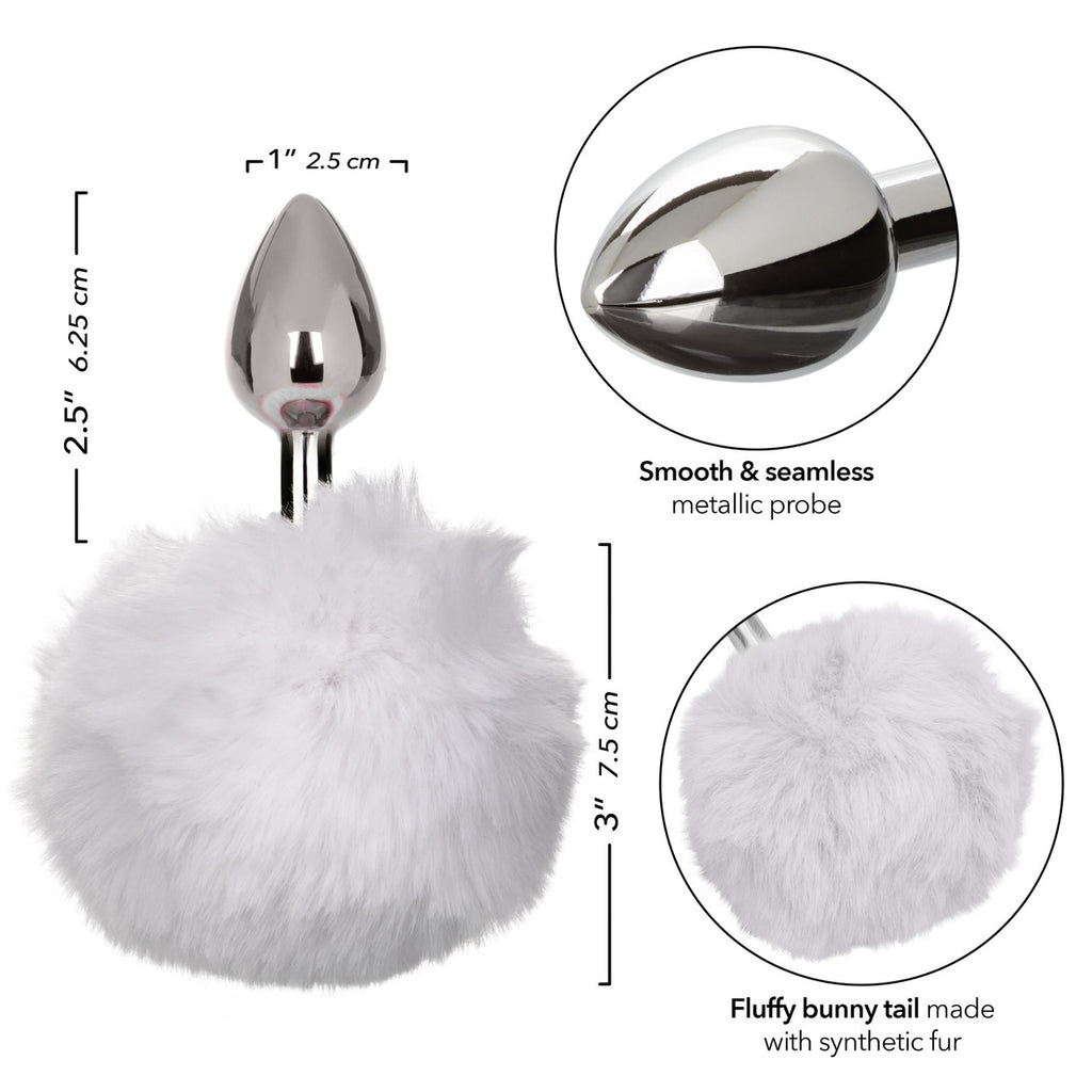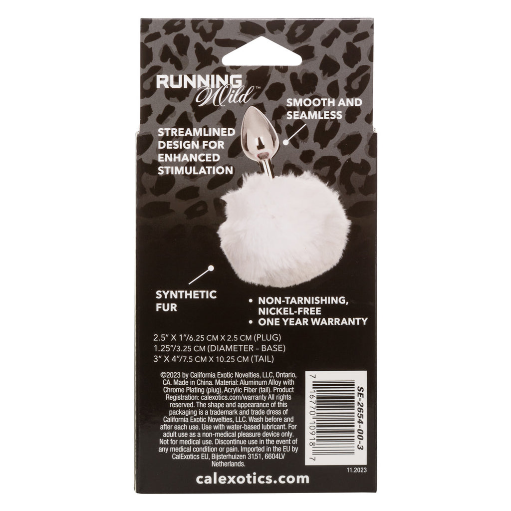 Running Wild White Bunny Butt Plug from California Exotic Novelties. Play free with the Running Wild Bunny Tail Butt Plug, a sleek and sophisticated metallic probe adorned with a whimsical fluffy Bunny Tail. This charming and playful accessory is perfect for those who appreciate fun and adventure in their sensual experiences. The Butt Plug is streamlined design ensures enhanced stimulation, gliding smoothly for a comfortable and delightful sensation. Its smooth surface is ideal for exploring and heightening your intimate moments, while the synthetic fur tail adds a touch of whimsy and allure. Crafted with care, this Butt Plug is non-tarnishing and Nickel free, offering peace of mind along with pleasurable sensations. Experience playfulness and pleasure with the Running Wild Bunny Tail Butt Plug.