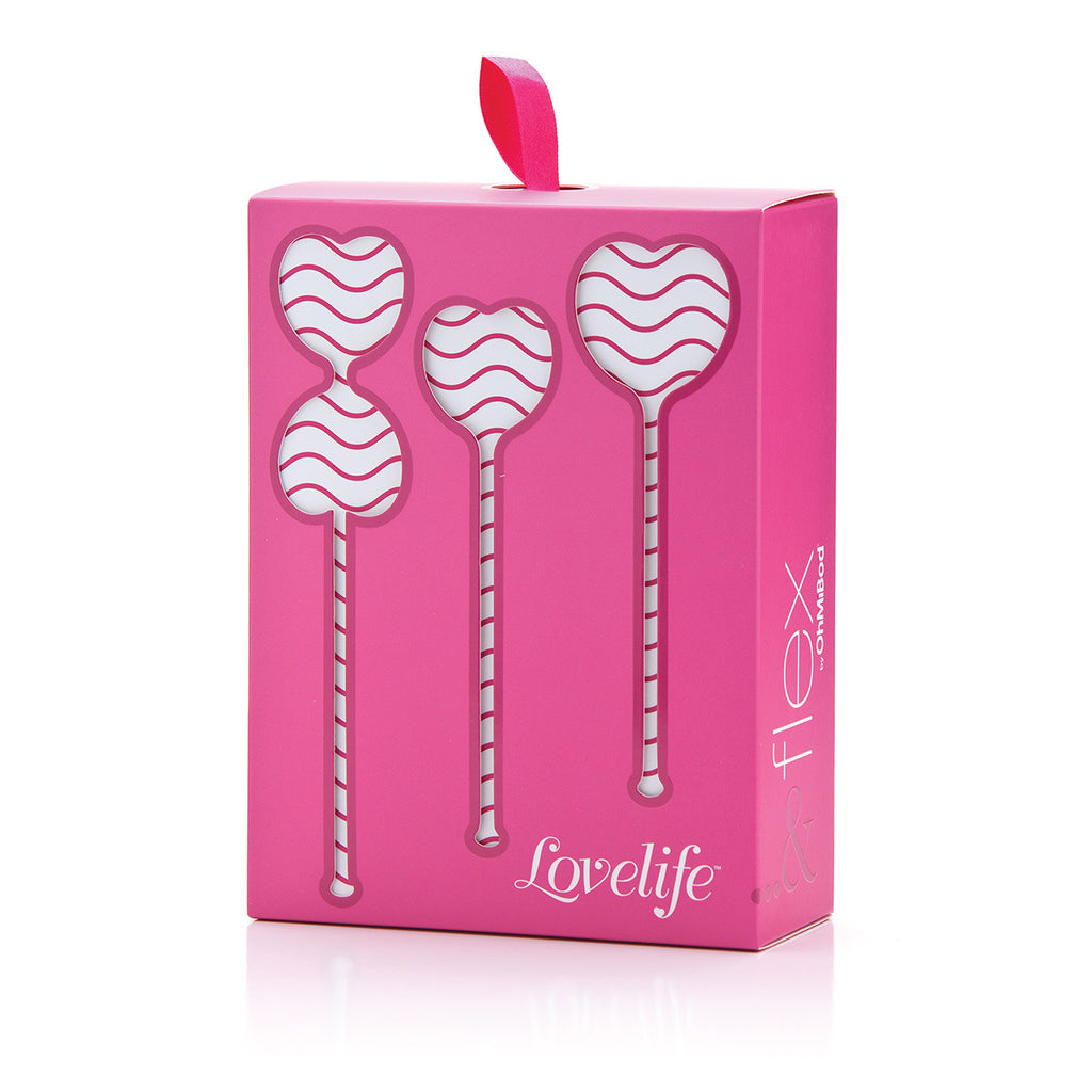 Lovelife Flex Kegels Set Of Three from Ohmibod. Save the sweat for the bedroom. Exercising your PC muscle with these set of three kegel weights for graduated strength training gives you all of the gain without the pain. Sized to accommodate both beginners and experts. Flex Kegel features: Silicone. Waterproof. Includes Satin Privacy Pouch, Warranty. Beginner Dimensions: 35g e or approximately 1.23 ounces,1.4 inches. Intermediate Dimensions: 45g e or approximately 1.58 ounces 1.14 inches. Advanced dimensions: 85g e or approximately 2.99 ounces 1.14 inches. 3 Kegel sets for graduated strength training. Sized to accommodate beginners and experts. Body safe silicone, Phthalate free. 1 year warranty