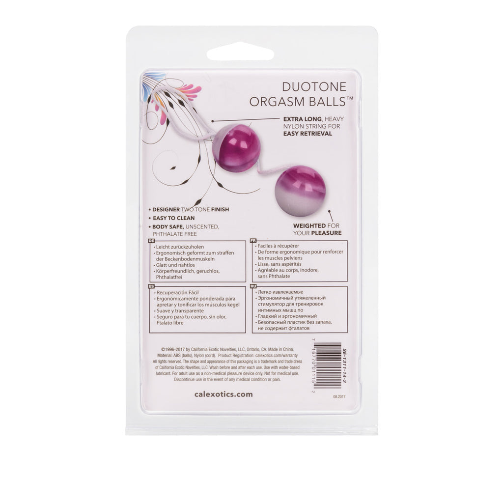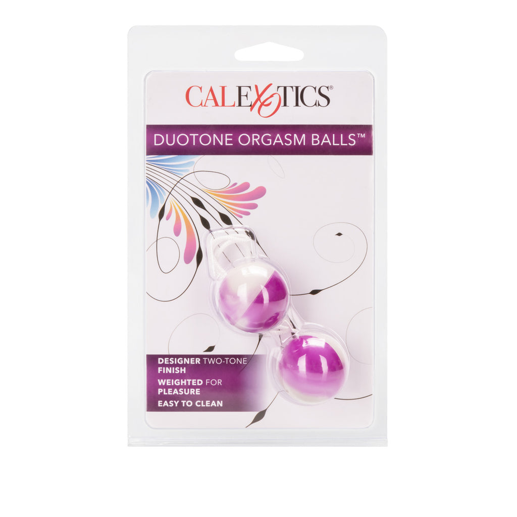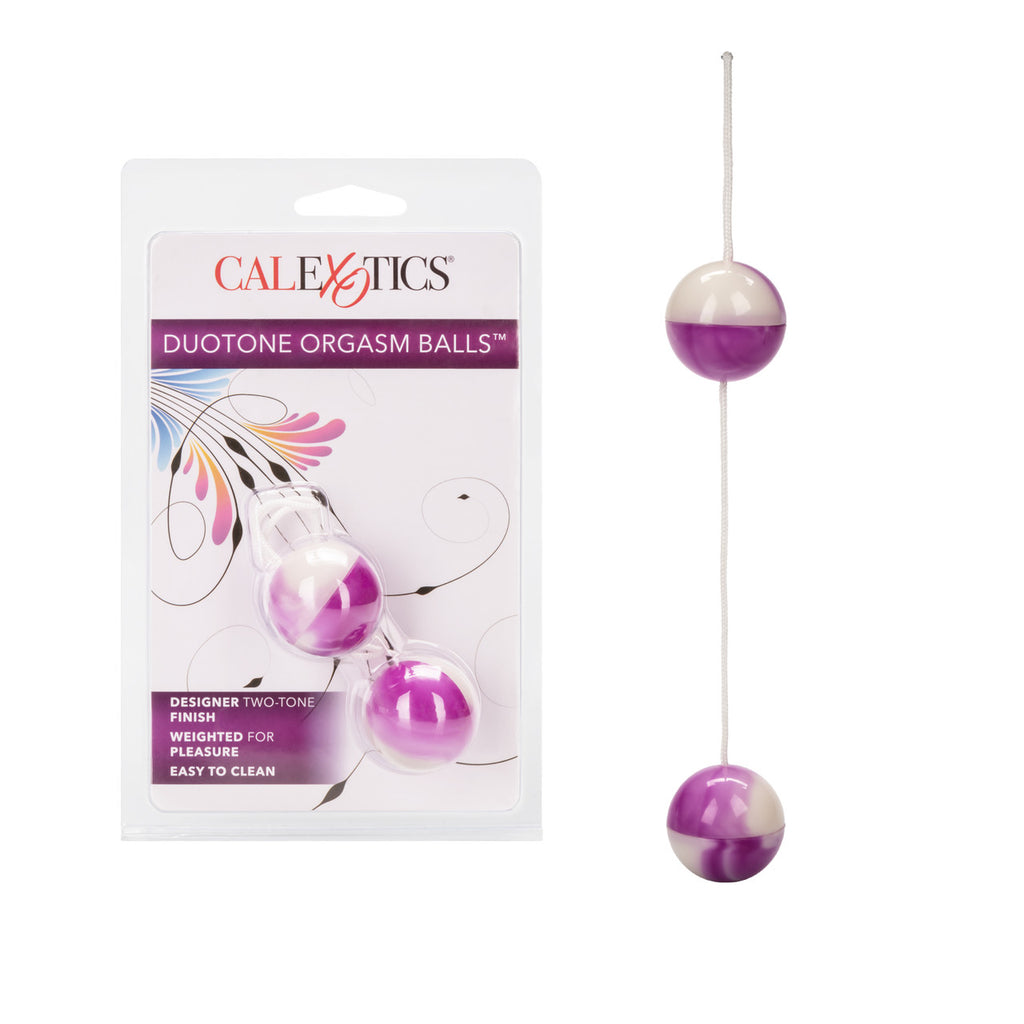 Duotone Orgasm Balls Purple Smooth plastic balls are weighted for vaginal exercise. String attachment for retrieval. Ben Wa style balls. Multiple use scientifically weighted balls can be used in conjunction with Kegel exercises. Balls do not vibrate with batteries but rather with kinetic energy. Use for pelvic exercise by holding them in to strengthen muscles. Safe and pure for body and pleasure. Made using phthalate free, non-toxic materials Balls ABS plastic, nylon cord. Each ball measures 1.25 inches in diameter. Bulk weight 2.5 ounces. Always clean before and after use plus between partners. Orgasm balls, Kegel balls, women's health, unisex toy. Category: For Women, Bullet, Beads & Balls, Balls, Product Specials. Duotone Orgasm Balls is a registered trademark for California Exotic Novelties. Sex toys and sexual wellness. New high resolution image added.