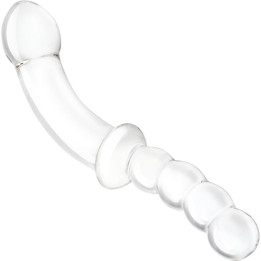 Get down with girth and the 12.5" Double Sided Curved Dildo With Anal Beads by Gläs. This extra-long, extra-thick anal allurer glides right to the P-spot with a pleasantly angled head that reaches deep with decadence. The ergonomic handle also doubles as a bead plug that flexes your sphincter with each pop of the bulb.