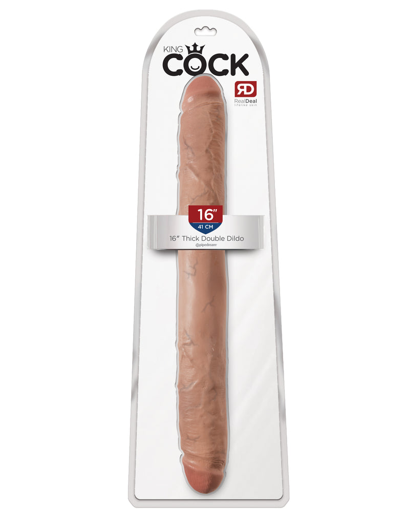 King Cock 16 inches Thick Double Dildo  Beige Real Deal RD. Do you want your first dildo to look and feel just like the rock hard stud you have always fantasized about? Stop dreaming and get down with the King! Every vein, every shaft, and every head is carefully hand crafted with exquisite detail to give you the most realistic experience ever imagined. Every King Cock is latex free, body safe and hypoallergenic PVC. Enjoy every masterpiece with confidence. Total length: 16 inches, width 1.75 inches, girth 5.5 inches. Vaginal insertion length 6 inches. Anal insertion length 6 inches. Bulk weight 1.75 pounds. 19 Real Deal RD.