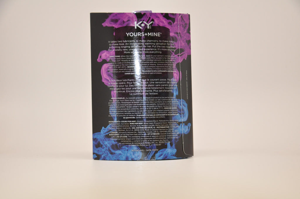 K-Y Brand Yours & Mine Couples Lubricants. His excites. Hers delights. Together feel them ignite. It takes two lubricants to make chemistry, to make magic, to make love. Whether you have a flame that needs rekindling or you're looking to take your relationship to the next level, we've got the perfect adventure for you both.It's simple. You apply the product to each other. The blue goes on him for an invigorating sensation. The purple goes on her for a thrilling sensation. And when combined, there's an amazing reaction. An invigorating warming sensation for him. A thrilling tingling sensation for her. Put the two together for a totally new, unexpected experience. It's more exciting. More satisfying. More everything. Let K-Y Brand Yours + Mine Couples Lubricants be a catalyst for exploration. When the moment feels right, apply to intimate areas as desired. Apply yours blue to him. And mine purple to her. Start with 1-2 drops. The sensations will heighten during intimacy. Over time, experiment with the amount you use to create the perfect sensation for both of you. Use as often as you like. Compatible with latex condoms. Do not use if quality seal on the opening of the bottles are broken or missing. Ingredients: Yours For Him: Glycerin, Propylene Glycol, Maltodextrin, Honey, Methylparaben, Sucralose. Mine For Her: Water, Propylene Glycol, Polysorbate 60, Hydroxyethylcellulose, Benzoic Acid, Menthyl Lactate, Methyl Salicylate, Fragrance, Sodium Hydroxide. Never use if you are pregnant or breast feeding. Categories: Lubricants, Desensitizing Personal Lubricant, Warming, Tingling, Health and Beauty. K-Y Yours and Mine Couples Lubricants is a registered trademark for McNeil Labs. Made in the USA.