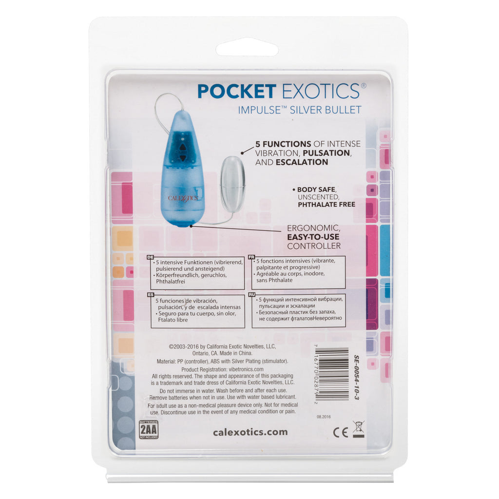 Pocket Exotic Impulse Pocket Pak Silver Bullet Vibrator from California Exotic Novelties. Experience 5 levels of intensity with this silver bullet. Powerful functions of vibration and pulsation. 2 vibration settings, 2 pulsation settings and one pulsate/vibrate setting. The sleek and ultra discreet Pocket Exotics Impulse Silver Bullet is a powerful personal massager with multi-function benefits. The bullet shaped stimulator has an easy touch control for ease of use, and is designed for optimal sensual pleasure. Use your imagination and let this power packed stimulator take care of the intimate fun. The compact bullet vibrator measures 2.25 inches in length by 1 inch and is made from durable body safe ABS Plastic with a Silver colored plated finish. The easy to use pocket sized vibe boasts 5 intense vibration and pulsation functions that are selected via the teardrop shaped PP controller. Great for the first time and experienced users who want to enjoy sensual fun on the run, the discreet size makes it ideal for slipping into your purse or pocket. To maximize the pleasurable tingles and erotic sensations, it is recommended that you use a quality lube with this toy. Before and after every use, clean the bullet stimulator with a toy cleaner spray. Bullet vibrator measures 2 inches long by 1 inch. Vibrating bullet requires requires 2 AA batteries, not included. Do not leave batteries in the vibrator between uses. A water based lubricant is recommended. Made using phthalate free, non-toxic materials: ABS plastic with silver plating. Impulse Pocket Pak Silver Bullet is a registered trademark for California Exotic Novelties. Categories: Vibrators, Bullets and Eggs, Palm Size Massagers, Health and Beauty Aids, Sex Toys for Women, Vibrating Bullets, Eggs. 2023.