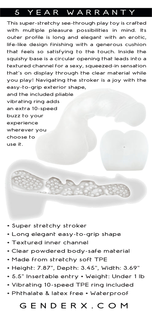 Features: super stretchy stroker. Long elegant easy to grip shape. Textured inner channel. Clear powdered body safe material. Made from stretchy soft Thermoplastic Elastomers TPE. Size height 7.87 inches, depth 3.45 inches, width 3.69 inches. 5.5 inches insertion entry. Bulk weight under 1 pound. Vibrating 10 speed Thermoplastic Elastomers TPE ring included. Made using phthalate free, latex free. Waterproof, non vibrating stroker. Categories: Prostate Massagers, P-Spot Stimulators, Sex Toys for Men, Masturbators, Dildos and Dongs Realistic. Vibrating Cock Ring. 2023.