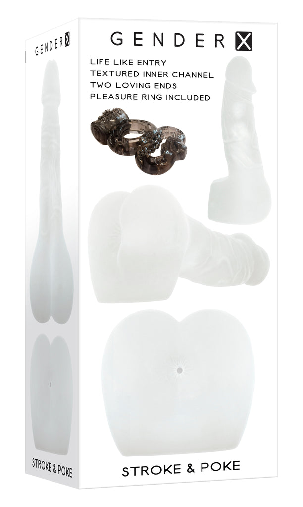 Gender X Stroke and Poke with Vibrating Cock Ring to increase and prolong your pleasure from Evolved Novelties. This super stretchy see through play toy is crafted with multiple pleasure possibilities in mind. Its outer profile is long and elegant with an erotic, life like design finishing with a generous cushion that feels so satisfying to the touch. Inside the squishy base is a circular opening that leads into a textured channel for a sexy, squeezed in sensation that is on display through the clear material while you play! Navigating the stroker is a joy with the easy to grip exterior shape, and the included pliable vibrating ring adds an extra 10 speed buzz to your experience wherever you choose to use it.