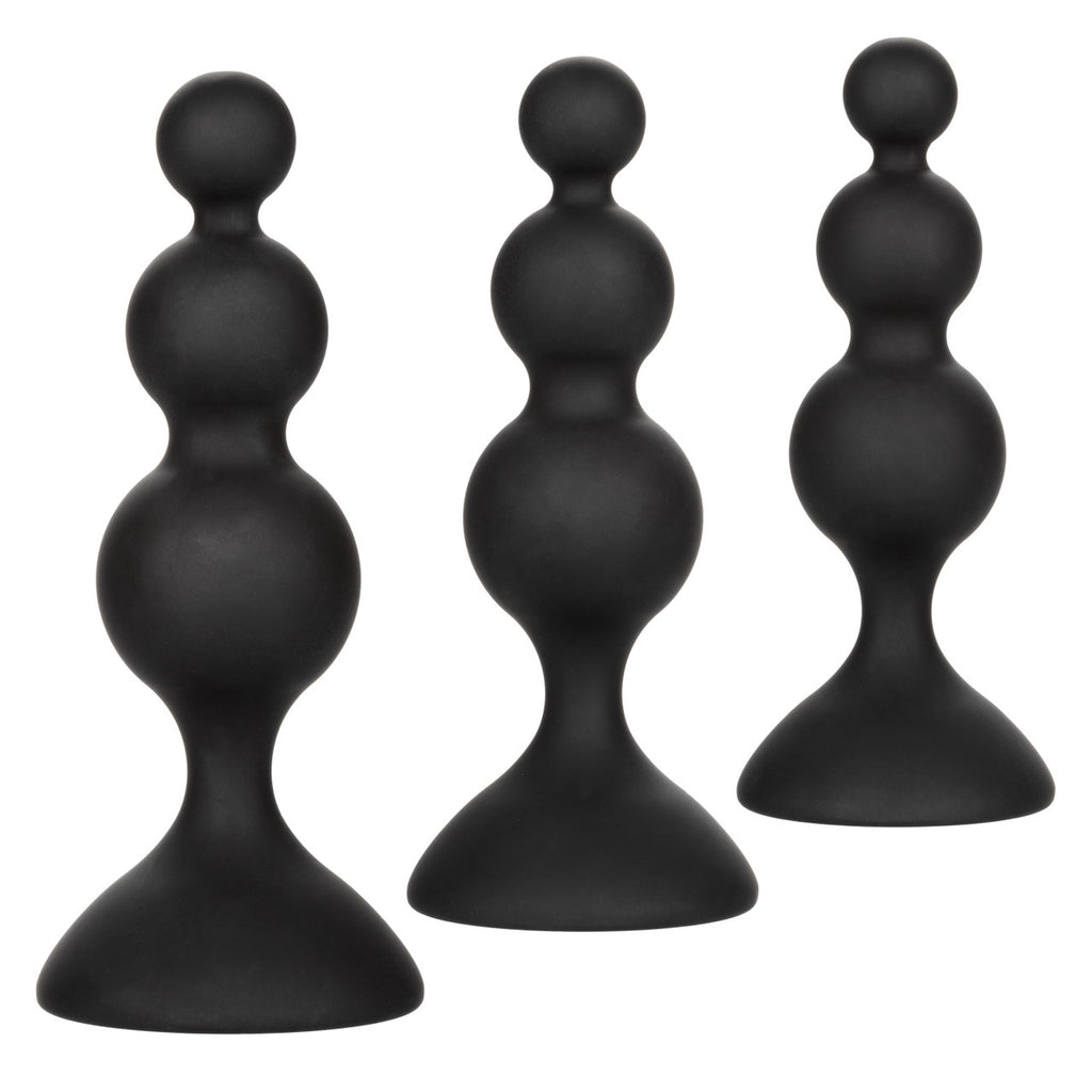 Anal Toys Silicone Beaded Trainging Kit 3 Plugs Black from California Exotic Novelties. Ideal for Anal Play or Prostate Stimulation. Experience superior anal training with the Silicone Beaded Anal Kit. Crafted from pure Silicone and featuring a luxurious Satin Finish, this Anal Kit is designed to provide you with a secure, comfortable, and pleasurable journey. The Anal Probes are tapered and beaded, allowing for easy insertion and a gradual increase in size. With three graduated sizes to choose from, you can customize your training and find the perfect fit to suit your desires. The sturdy suction cup base ensures stability during use, providing hands free pleasure and the freedom to explore different positions. Made from pliable and durable Silicone, this Anal Kit offers flexibility and resilience, ensuring a comfortable and long lasting experience. The Silicone material is not only body safe but also hygienically superior, making it easy to clean and maintain. Indulge in the pleasures of anal exploration and take your training to new heights with the Silicone Beaded Anal Kit. Discover the joys of heightened sensations and fulfilling experiences with this versatile set.