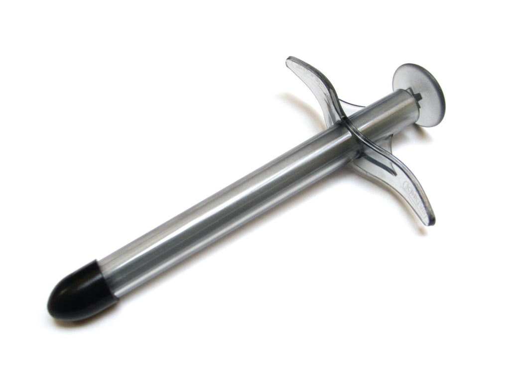 Lube Shooter  from Kink Lab. Contains 3 disposable plastic applicator tips and 1 plunger. Get it between the cheeks, not on the sheets with the only lube up sell on the market! Lube is an adult retail staple and a guaranteed source of sales any time of the year. The original Lube Shooter now being offered as part of the Kink Lab beginner bondage line can be sold along side any lube you carry because this refillable applicator is compatible with any type or consistency of personal lubricant, from water based liquids to hard to handle creams. This disposable lube applicator is now available in an array of jewel tone colors, color code your lubes by type or by their destination for safer, more sanitary play. To fill it, either pull out the plunger completely and pour lubricant into the barrel straight from the bottle- or if your lube comes in a tub, dunk the entire assembly in the container and pull up the plunger to fill. Do not double dip plus make sure to use a clean barrel each time! The hypodermic style construction guarantees that you will not spill a drop on your partner or on your sheets till you press down the plunger. Dimensions: applicator is 5 inches from base to tip by 1 inch in circumference. Plunger is 4 inches from base to tip by .5 inch in circumference. 19