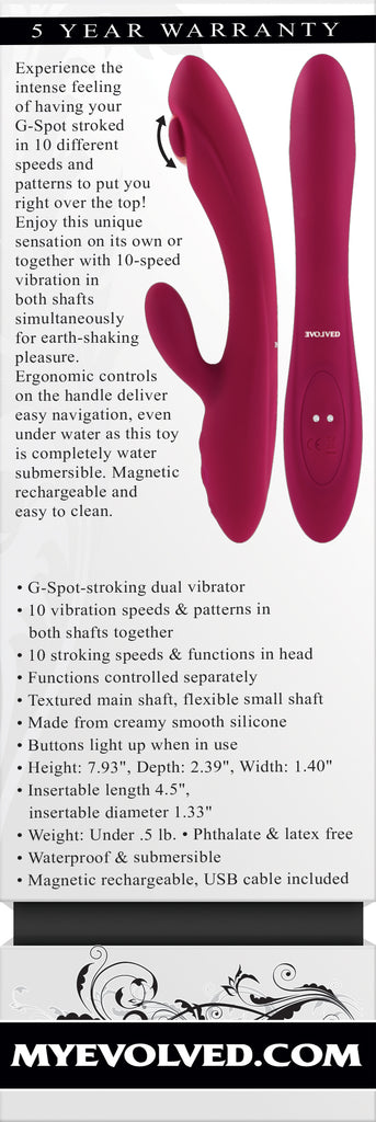 Features: G-Spot Stroking Dual Vibrator. 10 vibration speeds and patterns in both shafts together. 10 stroking speeds and functions in head. Functions controlled separately. Textured main shaft, flexible small Shaft. Made from creamy smooth Silicone. Buttons light up when in use. Size: Height 7.93 inches. Depth 2.39 inches. Width 1.40 inches. Insertable length 4.5 inches. Insertable diameter 1.33 inches. Bulk weight under half a pound. Waterproof and submersible. Phthalate free and latex free. Magnetic Rechargeable, USB cable included. Categories: Vibrators, Rabbit Style Vibrators, Rechargeable Vibrators, Sex Toys for Women, G-Spot Rabbit Style Vibrators. 2023.