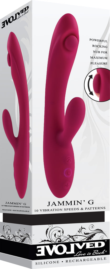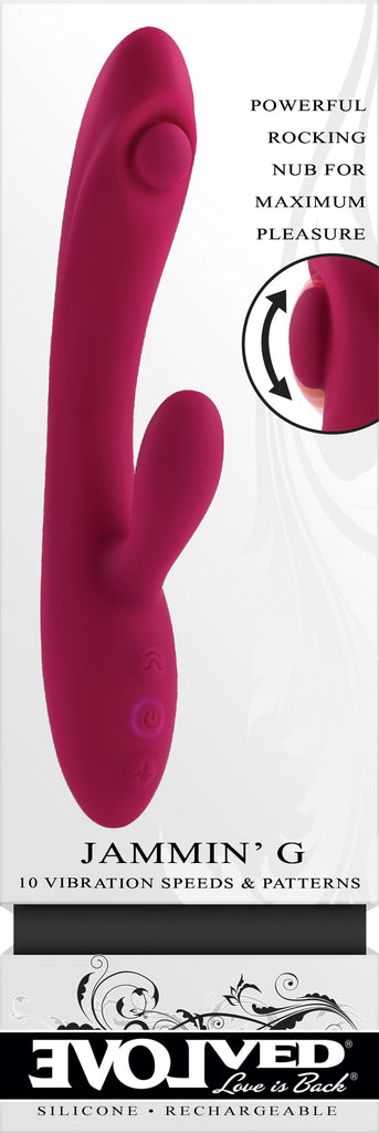 Evolved Jammin G Rabbit Vibrator. Jammin G! Experience the intense feeling of having your G-Spot stroked in 10 different speeds and patterns to put you right over the top! Enjoy this unique sensation on its own or together with 10 speed vibration in both shafts simultaneously for earth shaking pleasure. Ergonomic controls on the handle deliver easy navigation, even under water as this toy is completely water submersible. Magnetic Rechargeable. Easy to clean.