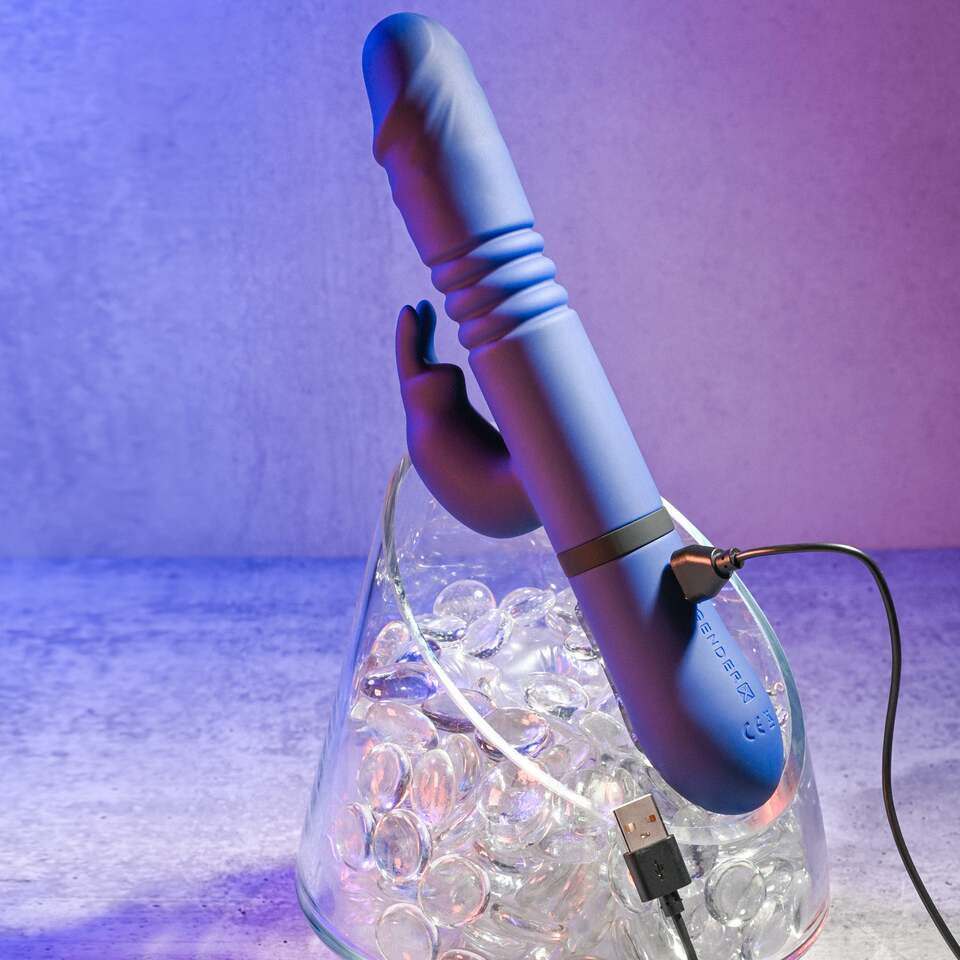 Gender X All In One Rabbit Vibrator from Evolved Novelties. This tall, smooth rabbit vibe is ready to thrust all night! With a supple, textured tip and an accordion center that stretches in and out, you will be amazed at the look and feel of the powerful thrust function. But this large fully submersible shape has a few more secrets up its sleeve. A powerful rabbit shaft whose bunny ears just will not quit, and rotating beads in the shaft that churn and spin with an erotic rhythm perfect for any massage! Between the thrusting, rotating and powerful vibrations, you will be headed for a mind melting experience in no time, especially with the ergonomic controls that let you customize as you go. Fully rechargeable and easy to clean! Thrusting rabbit vibrator with rotating shaft beads. Shaft thrusts with 3 speeds, 10 powerful vibrating speeds and functions. Beads rotate down shaft for churning massage vibrating rabbit stimulator. Blue LED illuminates buttons when in use. Materials Vibrator made from body safe, phthalate free Silicone. Detail made from black chrome finished ABS plastic. Dimensions: overall length 9.8 inches, insertable length 5 inches, width 1.55 inches. Shaft thrusts .5 inch. Waterproof and submersible vibrator. Magnetic Rechargeable Vibrations via USB, cable included. 5 years warranty. New images lifestyle added. Evolved Novelties - Gender X. Categories: Rabbit Style Vibrators, Rechargeable Vibrators, Sex Toys for Women, G-Spot Rabbit Style. 2023.