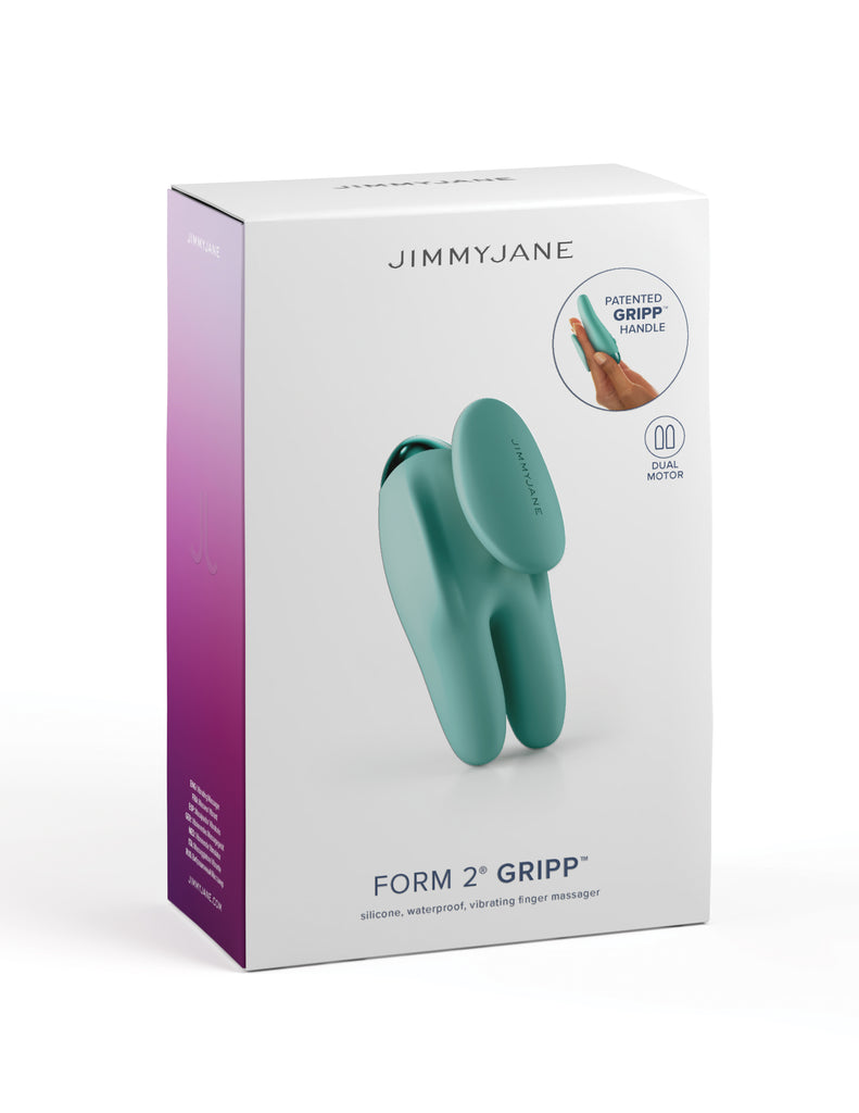 JimmyJane Form 2 Gripp 2 Prong Green Vibrator from Pipedream Products. Meet your new partner in pleasure, the Form 2 Gripp. Our award winning, best selling shape redesigned with ease of maneuverability in mind. The innovative Gripp holder effortlessly slips between your fingers allowing you to easily position the Vibrator in a range of positions. Made with supple, soft, and flexible Silicone, it easily contours, pinches, and teases your clitoris. In addition, your choice of 25 high performing vibration functions allows you to easily send ripples of pleasure from head to toe. The dual vibrating, flexible ear design surrounds the Clitoris with concentrated vibrations. Designed with super soft and flexible phthalate free, latex free Silicone. Choose between 25 high performing functions. Five vibration modes with five speeds per mode. 60 minutes run time. Comfortable Gripp finger holder for easy, no slip control. Used by women and couples. Great for clitoral and nipple stimulation. Waterproof; fully submersible, bath friendly and washable. Rechargeable, Magnetic USB Cord and Cloth Storage Bag included. Form 2 Gripp Patent Pending. Size length 3.80 inches. Width 1.96 inches. Charging run time 60 minutes. Recharge time 90 minutes. Materials: Silicone, ABS Plastic.