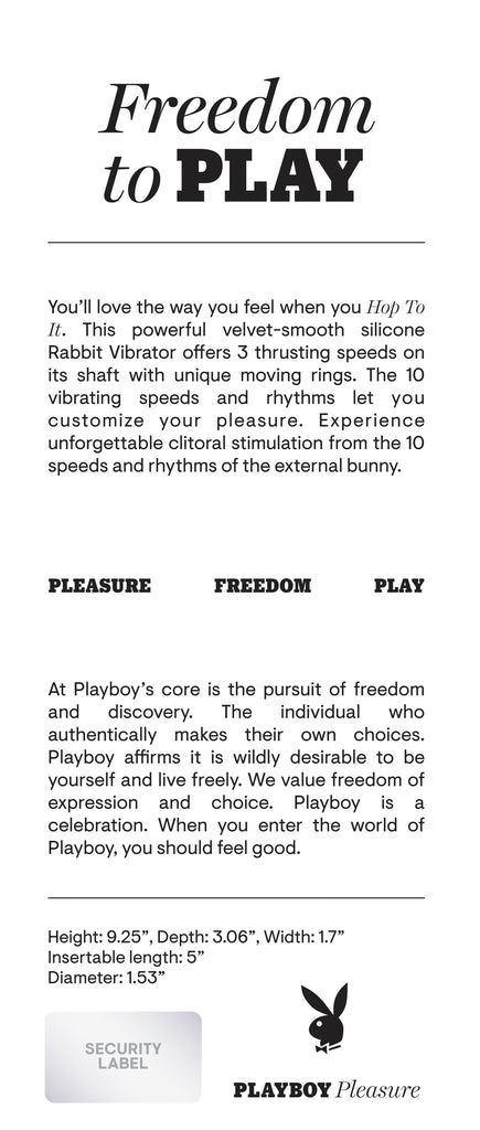 Playboy Hop To It Rabbit Vibrator from Evolved Novelties. The freedom to play is yours with Playboy Pleasure. You will love the way you feel when you Hop To It. This powerful velvet smooth Silicone Rabbit Vibrator features unique moving rings along its shaft that provide the sensation and movement of thrusting in a new way. The 3 thrusting speeds and 10 vibrating speeds and rhythms let you customize your pleasure. Experience unforgettable clitoral stimulation from the 10 speeds and rhythms of the external bunny.