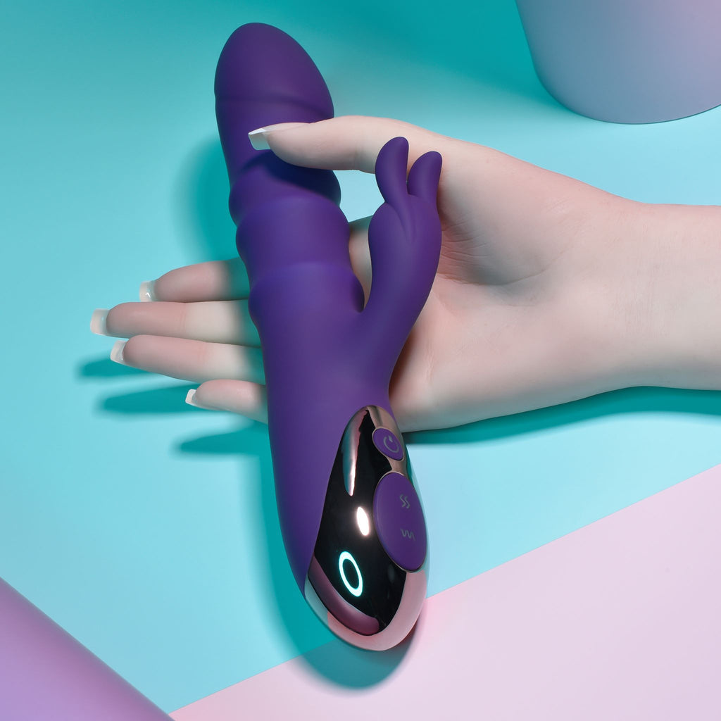 Specifications: unique 3 ring moving shaft Rabbit Vibrator. Materials: Body safe Silicone, Phthalate free, Latex free. Size height 9.25 inches, depth 3.06 inches, width 1.7 inches, diameter 1.53 inches. 3 thrusting shaft speeds. 10 vibrating shaft speeds and rhythms. 10 vibrating Clitoral speeds and rhythms. Hold power button for 2 seconds to turn on/off. Additional buttons control vibrations and speeds. Magnetic USB Rechargeable. Charging time 200 minutes. 90 minutes run time on high power. 110 minutes run time on low power. Waterproof vibrations. Submersible for easy cleaning and play outside the bedroom. 5 years manufacturer's warranty. Care: only use a water based personal lubricant. Clean with a toy cleaner, rinse with warm water, pat dry dry before storage. Categories: Vibrators, Rabbit Style Vibrators, Rechargeable Vibrators, Sex Toys for Women, G-Spot Rabbit Style Vibrator. Play with me. Playboy and Rabbit Head design are registered trademarks of Playboy International. All rights reserved. 2023.
