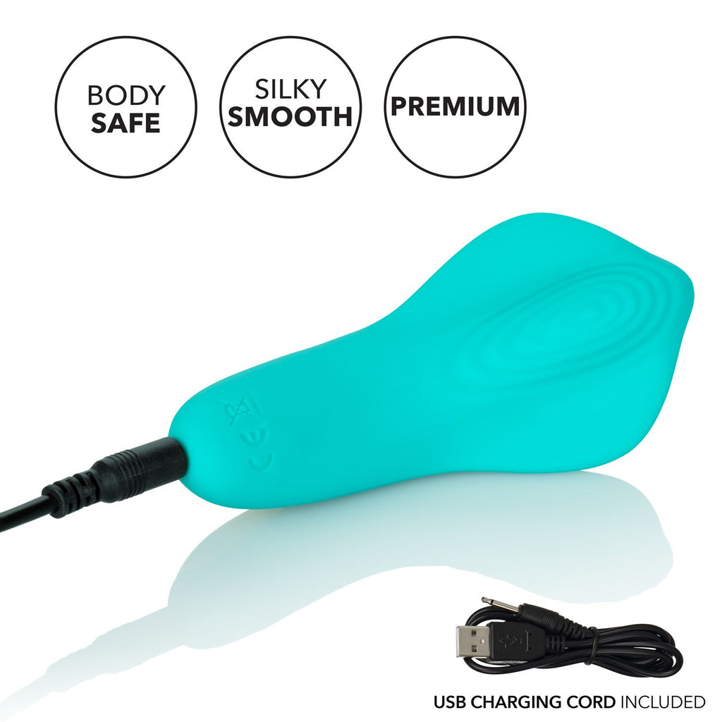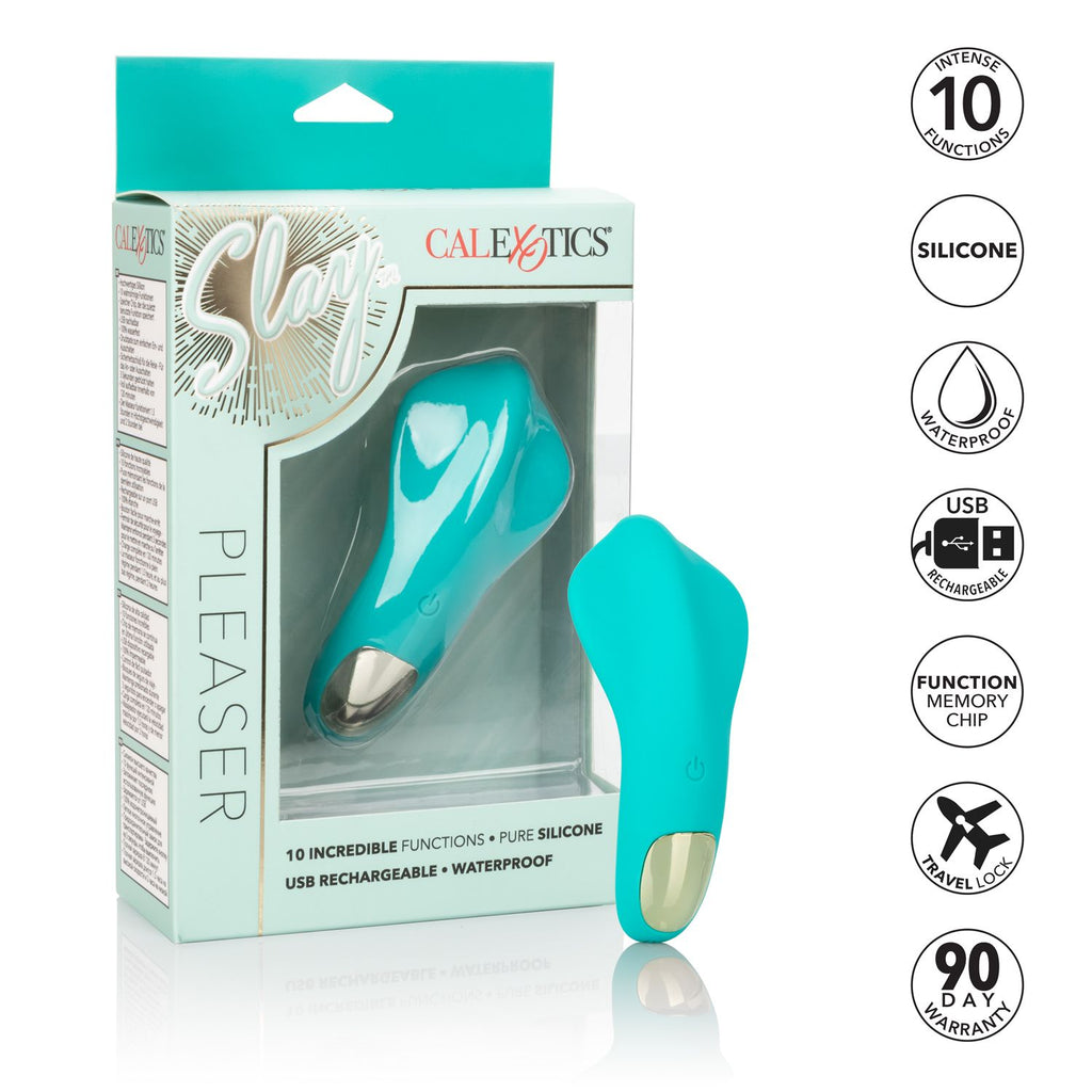 Slay Pleaser Green Vibrator from California Exotic Novelties. Slip the tickling Slay Pleaser into your purse or handbag for knee shaking pleasure wherever you go. The sensually contoured massager fits between your fingers to let you deliver pinpoint tantalization and thrill with flexible vibrations. Get playful while you flicker through 10 indulgent vibration, pulsation and escalation functions with the easy touch control button. The ergonomically curved toy can be used as a vivacious mini vibrator or discreet panty teaser for pleasure to go. Effortlessly control pure pleasure with an easy touch silicone button and hold for 3 seconds to turn on or off. Use the smooth single button control to enjoy up to 1.5 hours of vibrating pleasure. Charge up your passion in only 2 hours by plugging the provided USB cable into the self sealing charging port on the back of the massager. The slim massager discreet 4 inches size makes it the perfect travel companion, letting you embrace radiating pleasure wherever your fantasies take you. Color Teal Green. Materials Silicone, ABS Plastic with Metallic Plating. Power source USB Rechargeable, cable included.