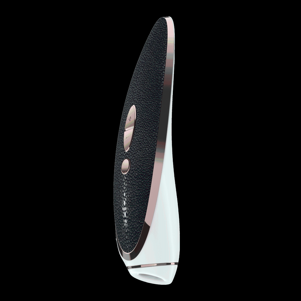 (WD) Satisfyer Luxury Haute Couture Clitoral Vibrator. In supple and elegant fashion, the ring of ultra soft, medical grade liquid silicone surrounds your pleasure bead and caresses it with the usual breath taking Satisfyer pressure wave stimulation. Its intuitive controls let you choose your favorites from 11 different intensity settings and enjoy the heavenly feeling of non-contact clitoral stimulation. The ergonomic shape of the Satisfyer Luxury Haute Couture sits comfortably in your hand, while the refined upper in sensuously structured leather will make you feel like a queen. The gold colored elements made of precious metal and the silky, matte body in smart white complete the luxurious design perfectly.
