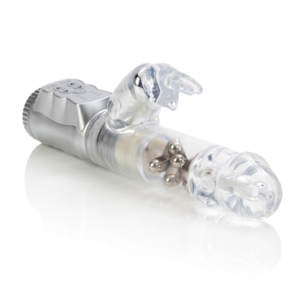 Waterproof Jack Rabbit  Vibrator. The Original just keeps getting better, and better, and better! Use in and out of the water. 100% waterproof for fun in or out of the water. The playful rabbit with its synchronized rotating metals beads and reversing action has 3 speeds of vibration, 3 speeds of rotation, and one touch activation. Easy to load battery case twists into the bottom. Rabbit vibrator is made using phthalate free, non-toxic materials PVC shaft and rabbit, ABS plastic base. Vibrator measures 10 inches of total length with 5.5 inches of insertable length. Shaft measures 4.75 inches long by 1.5 inches wide. Bulk weight 14.6 ounces. Vibrating sex toy requires 3 AA batteries, not included. Always clean before and after use plus between partners. Remove the batteries before storage. Category: For Women, Vibrator, Vibrators, Top Selling Sex Toys. Waterproof Jack Rabbit Vibe is a registered trademark for California Exotic Novelties. Sex toys and sexual wellness. 16.