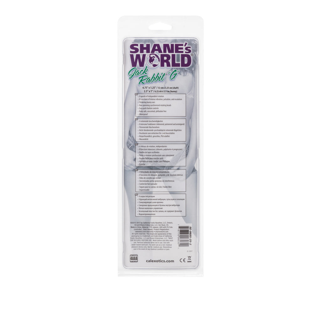 Shane's World line from California Exotic Novelties Jack Rabbit G Vibrator . World famous Jack Rabbit with an accentuated G-spot curve. Sized for beginner, intermediate, and advanced users. 8 intense functions of vibration, pulsation and escalation. 4 speeds of independent shaft rotation. 5 rows of non-jamming, rotating beads.Easy to use LED control panel. Waterproof for play in and out of the water. Safe and pure for body and pleasure made using phthalate free materials: Thermoplastic Elastomers TPE massager, ABS plastic with polyurethane PU Cote controller, Steel beads. 4.75 inches by 1.25 inches shaft. 2.5 inches by 1 inch rabbit. Requires 4 AAA batteries, not included.